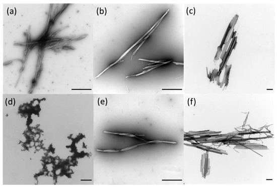 TEM recordings of fibrils obtained from PTH25–37, cis-AzoPTH25–37, and trans-AzoPTH25–37 at 37 °C after 20 h (scale bar = 500 nm): (a) trans-AzoPTH25–37 (100 μM), (b) trans-AzoPTH25–37:PTH25–37 (100 μM:100 μM), (c) trans-AzoPTH25–37:PTH25–37 (10 μM:100 μM), (d) cis-AzoPTH25–37 (100 μM), (e) cis-AzoPTH25–37:PTH25–37 (100 μM:100 μM), and (f) cis-AzoPTH25–37:PTH25–37 (10 μM:100 μM).