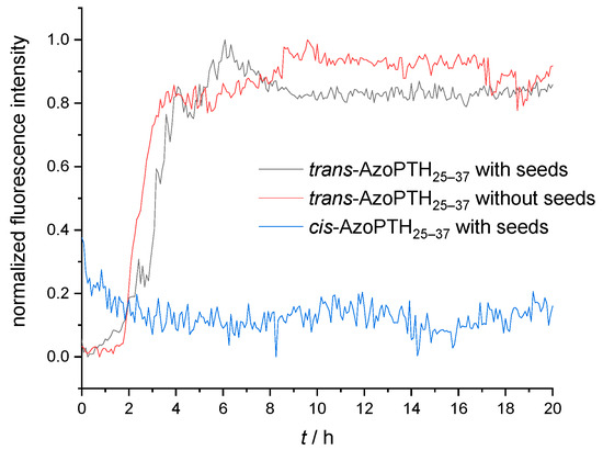 To determine whether both isomers of AzoPTH25–37 are able to form fibrils or only the trans-isomer, we investigated, if trans-AzoPTH25–37 fibrils were able to induce seeding [50]. A 100 μM solution of each isomer was treated with 20 μM of mature trans-AzoPTH25–37 fibrils, and the kinetics of the fibril formation were investigated via a ThT-monitored fibrillization assay (Figure 8). While the fibrillization of the trans-isomer was accelerated compared to the unseeded monomer, we were not able to observe fibrillization for the cis-isomer. This indicates that the cis-isomer is unable to nucleate amyloid formation as well as elongate preformed fibrils. The observed fibrils after 60 h for the cis-isomer are presumably formed by the thermally isomerized trans-isomer.