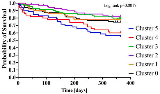 The one-year mortality from cluster 0 to cluster 5 was: 26% vs 22% vs 17% vs 21% vs 40% vs 43%, p = 0.002, respectively (Table 4).
