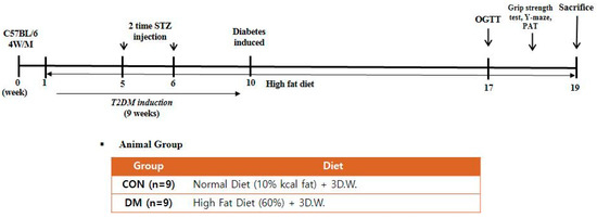 Four-week-old male C57BL/6 mice (Raon Bio, Seoul, Korea) were used in the experiments. Mice were housed three per cage, as group housing promotes social exploration and provides each other social support when faced with a stressful situation. Mice were maintained under controlled temperature (22 ± 1 °C), humidity (50 ± 5%), and 12 h light and dark cycle. After acclimation for 1 week, a randomly allocated diabetic group was fed with a 60% kcal high-fat diet (D12492; Research Diets, New Brunswick, NJ, USA), whereas a non-diabetic control group (CON) was fed with a 10% kcal control diet (D12450J; matching sucrose to D12492, Research Diets, New Brunswick, NJ, USA). Food and distilled water were provided ad libitum. After four weeks, the animals were divided into two groups; CON: a normal control group and DM: a diabetes mellitus group (n = 9 per group). T2DM was induced by intraperitoneal (i.p.) injection of 60 mg/kg streptozotocin (Sigma-Aldrich, St. Louis, MO, USA) dissolved in citrate buffer (pH 4.5) once a week for two consecutive weeks. Non-diabetic mice were injected with only a citrate buffer. Every week after the second injection, fasting blood glucose (FBG) was measured from the mice’s tail vein using One-touch select glucometer (LifeScan, Inc., Milpitas, CA, USA). Mice with FBG > 250 mg/dL at least twice in four weeks were considered diabetic [20]. After nine weeks of diabetes induction, the CON group was fed a control diet, and the DM group was fed a high-fat diet for an additional nine weeks (Figure 1). During the experiment, body weight, food intake, and FBG levels were measured weekly. The animals were anesthetized at the end of the experiment. Blood samples were collected by heparin (Sigma Aldrich, St. Louis, MO, USA) coated syringe by cardiac puncture and were centrifuged at 845× g for 15 min to obtain plasma. The skeletal muscle (gastrocnemius), liver, and hippocampus tissue were frozen immediately in liquid nitrogen and stored at −80 °C until they were used for analysis. All experiments were approved by Kyung Hee University for animal welfare [KHSASP-20-060] and performed in accordance with the guidelines.