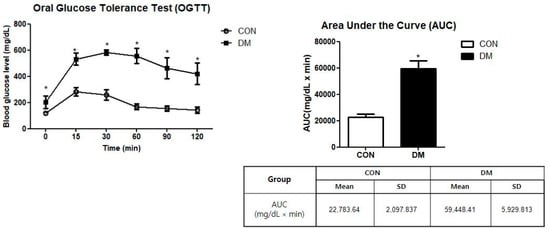 The DM group showed significantly higher values of FBG levels measured during OGTT than the CON group. As a result of the AUC measurement, the DM group showed significantly higher values than those of the CON group (Figure 2).