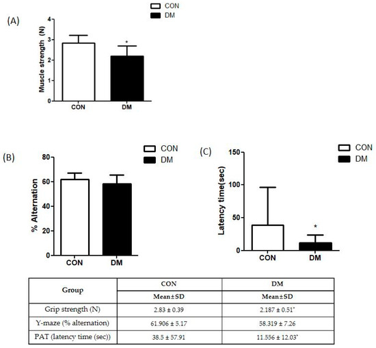 Behavior test in T2DM mice (A) grip strength test and (B) Y-maze test (C) passive avoidance test All values are reported as mean and SD. The asterisk represents statistical significance of differences from * p < 0.05. n = nine mice in each group. CON, normal control mice; DM, diabetes mellitus mice.