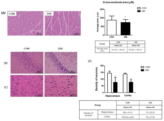 Skeletal muscle (gastrocnemius) and brain tissue were isolated and fixed in 10% buffered formaldehyde solution, dehydrated, and then embedded in paraffin wax. Tissue sections were cut into 4 µm thickness and stained with hematoxylin and eosin (H&E) by removing paraffin in xylene and rehydration in alcohol. After drying, the stained tissue sections on the glass slide were mounted with a histological mounting medium (Histomount, Atlanta, GA, USA). Tissue sections were observed using an optical microscope (Nikon ECLIPSE Ci, Nikon Instrument, Tokyo, Japan). The average cross-sectional area of skeletal muscle and the density of neurons in brain tissue were analyzed using ImageJ (National Institutes of Health, Bethesda, MD, USA) [23].