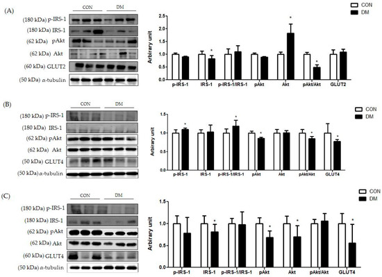 In hepatic tissue, the protein level of p-IRS-1 (Ser) was not different between the groups. The protein level of IRS-1 was decreased in the DM group compared to that of the CON group. Furthermore, the ratio of pAkt/Akt was decreased in the DM group compared to that of the CON group (Figure 6A).