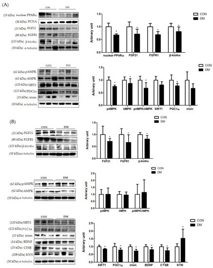 In skeletal muscle, the protein levels of FGF21, FGFR1, and β-klotho were decreased in the DM group compared to those of the CON group. The protein level of skeletal muscle AMPK was not different between the groups. The protein levels of skeletal muscle SIRT1, PGC1α, irisin, BDNF, and CTSB in the DM group were decreased compared to those of the CON group. The protein level of KYN in the DM group was increased compared to that of the CON group (Figure 7B).