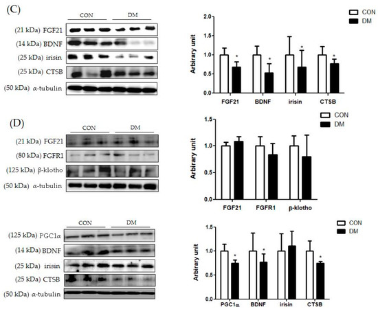 In addition, this study investigated myokines and hepatokines released in circulation which can cross the BBB and have potential roles in neuronal protection. The protein levels of plasma FGF21, BDNF, irisin, and CTSB in the DM group were decreased compared to those the CON group, in accordance with their levels in skeletal muscle and hepatic tissue.