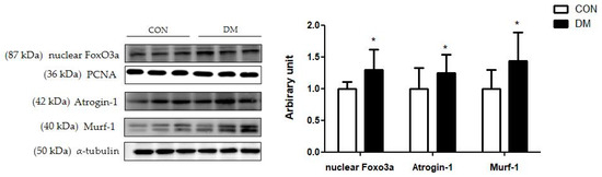The protein levels of skeletal muscle nuclear Foxo3a, Atrogin-1, and Mulrf-1 in the DM group were increased compared to those of the CON group (Figure 8).