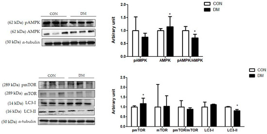 The protein level of hippocampal pmTOR was increased in the DM group compared to that of the CON group. The protein level of mTOR was not different between the groups. Furthermore, the pAMPK/AMPK ratio was decreased in the DM group compared to that of the CON group. The protein level of hippocampal LC3-I was not different between the groups. The protein level of LC3-II was decreased in the DM group compared to that of the CON group (Figure 9).