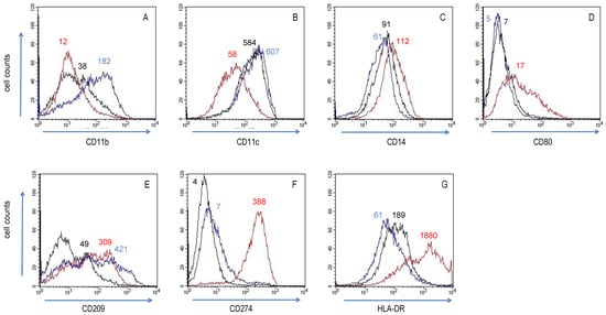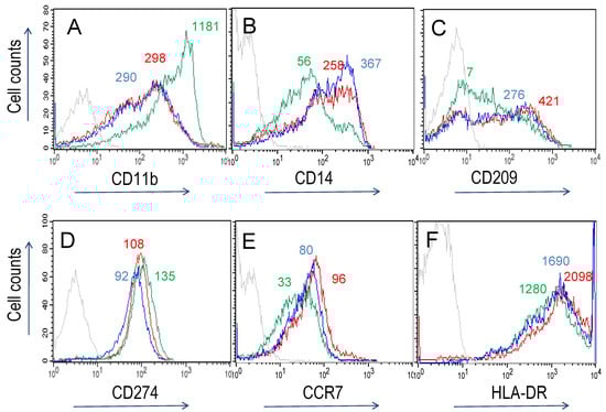 Phenotypic analysis of macrophages differentiated from adherent cells isolated from human peripheral blood and cultured for 6 days. M0, M1 and M2 macrophage phenotypes were obtained by culturing cells in basal medium, medium containing GM-CSF and M-CSF, respectively. Levels of CD11b (A), CD14 (B), CD209 (C), CD274 (D), CCR7 (E) and HLA-DR (F) expression in cells cultured in basal medium (red, M0 macrophages), GM-CSF (green, M1 macrophages) or M-CSF (blue, M2 macrophages) Substances induced MFI intensity differences of ≈2-fold (e.g., CD274 (D)) to >100-fold (e.g., CD14 (B)). Staining with isotype control antibodies: light grey. MFI values are indicated for the major peak of the colour-coded cytofluorometric curves (see also Supplementary Table S1). Only surface determinants where marked differences between cultured conditions were observed are shown.