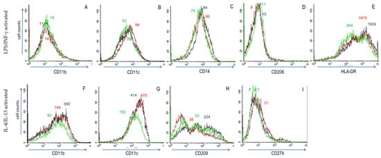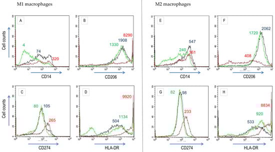 Adherent cells, isolated from PBMCs, were cultured for 6 days with GM-CSF or M-CSF to induce M1 and M2 macrophages, respectively. They are also termed polarized M1 (M1p) and polarized M2 (M2p) macrophages [17,49,50]. At these culture conditions, M1 and M2 microphage differentiation is mirrored by the expression of distinct surface markers (Figure 3, Table 1). Cell-specificity of antibodies was determined by staining freshly isolated PBMCs (Figure S1). In vitro differentiated macrophages up-regulated CD14 and CD209, where the staining pattern indicated the appearance of intermediate-positive and bright-positive subpopulations (Figure 3). We compared surface expression on M0 macrophages (no CSF added to culture medium) to those of M1- or M2-differentiated macrophages. M1 macrophages displayed increased levels of CD11b and CD274, while the density of CD14 and CD209 was decreased (Figure 3, Table 1). M0 and M2-differentiated macrophages had similar surface density of CD11b, CD209 and HLA-DR (Figure 3). Collectively, the differences in expression of CD11b, CD14, and CCR7 (not shown) were diagnostic for M1 and M2 macrophage differentiation patterns (see also [7,18,44]. In addition, LPS/INF-γ activation on M1 and M2 macrophages caused down-regulation of CD14, CD11b, and CD11c (not shown).
