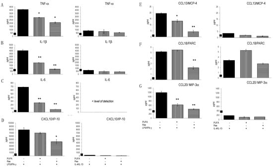 Secretion of cytokines and chemokines by THP-1 cells stimulated with LPS/IFN-γ or IL-4/IL-13. Cells were cultured for 20 h and culture supernatants analysed for interleukins/cytokines and chemokines. Black squares on the y-axis indicate the level of metabolite secreted by unstimulated cells. (A) TNF-α, (B) IL-1β, (C) IL-6, (D) CXCL10/IP-10, (E) CCL13/MCP-4, (F) CCL18/PARC, (G) CCL20/MIP-3α. Mean values ± standard deviation [pg/mL] of triplicates of a representative experiment (of three performed) are given. * p < 0.05, ** p < 0.01 (compared to LPS/INF-γ or IL-4/IL-13-activated cells).