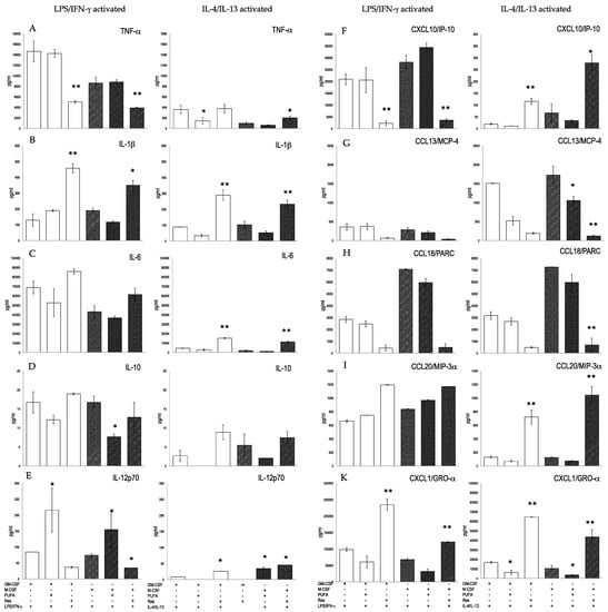 Secretion of cytokines and chemokines by macrophages differentiated from PBMCs. Adherent cells isolated from peripheral blood were cultured in GM-CSF (open bars) and M-CSF (hatched bars) for M1 and M2 differentiation, respectively, for 7 days, followed by activation with LPS/IFN-γ or IL-4/IL-13 for 24 h. (A) TNF-α (B) IL-1β, (C) IL-6, (D) IL-10, (E) IL-12p70, (F) CXCL10/IP-10, (G) CCL13/MCP-4, (H) CCL18/PARC, (I) CCL20/MIP-3α, (K) CXCL1/GRO-α. Mean values ± standard deviation [pg/mL] of triplicates of a representative experiment (of four performed) are given. * p < 0.05, ** p < 0.01 (vs. activated cells).