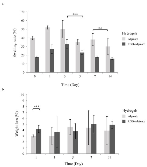 The degradation of alginate hydrogels is mediated by calcium ion exchange in the local environment and not by the cleavage of molecular bonds [26]. The degradation rate of alginate hydrogels is dependent on the physiologic pH of the surrounding medium and the initial ionic strength of the solution used for crosslinking. It has been demonstrated that alginate hydrogels crosslinked at pH 6 or 7 can more stably maintain a swelling ratio than those crosslinked at pH 8 [27]. Likewise, both alginate and RGD-alginate hydrogels crosslinked at pH 7 and incubated in a solution that approximated in vivo conditions in this study, were found susceptible to excessive swelling throughout the 14 days of investigation. The RGD-alginate hydrogels showed low weight loss (4.3%) on day 1 whilst retaining the degradation rate consistently onwards without significant difference (Figure 1b). A similar trend was shown by unmodified alginate hydrogels with a significant difference on day 1. It has been reported that chemical crosslinking method contributed to the stable structure of RGD-alginate hydrogels to remain a low and consistent degradation [28].