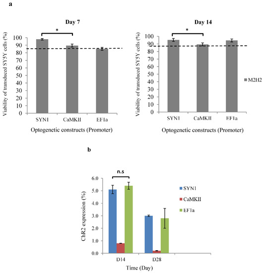 The ability to confer optogenetic control over different neuron subtypes is dependent upon the control of ChR2 with cell type-specific promoters, such as the use of CaMKII to target excitatory glutamatergic neurons. In this study, lentiviral vectors successfully delivered transgenes ChR2-YFP or ChR2-GFP into the neuronal differentiated human SH-SY5Y cells. ChR2 expression was mediated and driven by CaMKII promoters, including SYN1 and EFIa promoters. An in vitro optogenetically control neurodegenerative disease model was developed using RA-BDNF differentiated human SH-SY5Y cells, and the efficiency of optogenetic transduction was evaluated. Transduction of differentiated human SH-SY5Y cells with viral load at MOI-2 in CaMKII, SYN1, and EFIa-driven cells showed an average of high cell viability (>85%) for 7 and 14 days (Figure 2a). SYN1-driven cells not only had significantly higher viability than CaMKII but also presented a higher percentage of ChR2 positive cells (Figure 2b) and a stronger expression level (Figure 2c). Higher transduction efficiencies are commonly obtained by increasing viral load or concentration but result in higher toxicity [29]. Interestingly, transduction at MOI-2 followed by re-transduction contributed to high cell viability and positive expression of ChR2. The high viability and low cytotoxicity after lentiviral transduction may be attributed to the human SH-SY5Y cells’ robustness and rapid recovery from cell stress.
