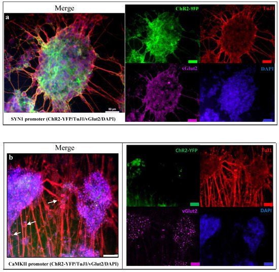 Immunofluorescent staining of neuronal differentiated human SH-SY5Y cells demonstrated positive expression of TuJ1 and vGlut2, containing ChR2-YFP under the control of (a) SYN1 promoter and (b) CaMKII promoter. The cells were cultured on a laminin-coated 24-well, glass-bottom plate in the complete medium after differentiation. The cells were then fixed, permeabilized, and stained with neural markers, TuJ1 (red) and vGlut2 (magenta) to identify the neuronal population. Opsin gene ChR2-YFP was expressed (labeled with green) whilst DAPI stained the nuclei blue. Functional vesicle transportation appeared as red dots along the neurites as shown in figure b (white arrows). Fluorescence images were obtained using confocal microscopy (Zeiss-LSM 780, Oberkochen, Germany) and processed with ZEN light software. Scale bar: 50 µm.