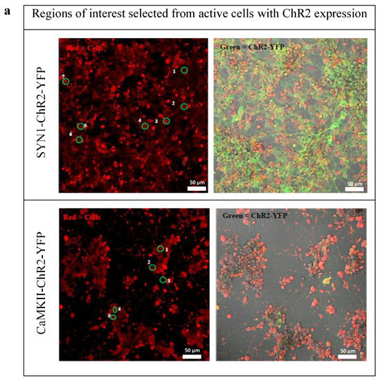 Flow cytometry results revealed that the ChR2 expression level in cells driven by pCaMKII-ChR2-YFP was lower than pSYN1-ChR2-YFP and pEF1a-ChR2-GFP on 14 and 28 days of transduction (Figure 2b). The low expression level and reducing the signal of pCaMKII-ChR2-YFP were further confirmed by the images captured using confocal microscopy (Figure 2c), suggesting that CaMKII is a weaker cell type-specific promoter than SYN1 and EF1a, in line with other reports in in vitro and in vivo studies performed by Dittgen, T. el al., and Rein, M.L. and Deussing, J.M. [30,31]. ChR2-YFP and ChR2-GFP were localized and expressed in the cell membrane and distributed along neurites. Neuron-specific and weaker promoters need to be considered because overproduced transgene products have been reported to be toxic in certain types of cells; thus, optimal degrees and patterns of transgene expression are required [32]. In contrast, a recent study reported positive ChR2 expression in targeting astrocytes using mCherry promoter and adeno-associated viral (AAV) vectors. An optogenetic construct, AAV-GFAP-ChR2(H134R)-mCherry was characterized and resulted in high astrocytic transduction (approximately 88%) with AAV8, successfully establishing light-induced intervention of astrocyte activity in the rat brain cortex [33].