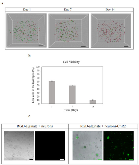 Neurons expressing ChR2 showed high cell viability in RGD-alginate hydrogels on days 1 and 7; however, live cells were decreasing when they reached day 14 of culture (Figure 5a,b). The cell death that occurred after 7 days may be due to consistent degradation of the RGD-alginate hydrogels that lead to cell loss or cell detachment. Another possible reason is the density of conjugated RGD that may be insufficient to support the long-term culture of this cell type, which is a limitation of this study. In response to the hydrogel materials used, different cell types and cell densities as well as adhesive peptide/RGD density attribute to different cell–matrix interactions [35]. In addition, the majority of the studies have demonstrated cell viability assessment for up to 7 days only [11]. For example, Raquel Maia and colleagues reported that a low cell seeding density of below 15 × 106 cells/mL, (e.g., 2 × 106, 5 × 106, 7.5 × 106 cells/mL) also exhibited a decreasing cell viability trend in human mesenchymal stem cells when cultured for 1 week in RGD-alginate 3D matrices [11,35]. The concentration of the hydrogel polymer is another key factor. Results showed by Dumbleton and colleagues suggested that the modification of alginate concentration with the RGD peptide resulted in significant changes in the cell morphology [36]. All cell types tested by them were reported to proliferate and grow better on the 2% alginate-RGD hydrogels than 2% alginate without RGD or 0.5% alginate-RGD hydrogels [36]. Live–dead cell staining and IMARIS software further revealed the localization of live/dead cells within the 3D hydrogels, with both live and dead cells distributed evenly (Figure 5b). When the modified and differentiated cells were encapsulated and transferred to 3D culture using RGD-alginate hydrogels, ChR2 was also found to stably express (YFP labeled with green) without being affected by the 3D culture environment and encapsulation process. The cells appeared in spherical aggregates within the RGD-alginate hydrogels upon encapsulation (Figure 5c). The observation is in line with our previous study utilizing human pluripotent stem cell-derived neurons, which were optogenetically modified [13]. When another cell type was used and tested in this study, the results further confirmed the efficiency of optogenetic constructs and demonstrated initial success in the development of a 3D in vitro model of neurodegenerative disease, which responded to optogenetic stimulation.