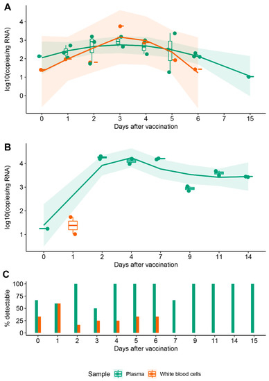 Template copy numbers decreased with the day of sampling. In plasma, mRNA was immediately detectable at just hours following vaccination, remained detectable when sampled at 6 and 15 days (Figure 1A, green), but was below the limit of quantification (LoQ) for one sample at 27 days. Samples from negative controls did not amplify. For subject B3, we observed a similar trend for plasma: vaccine-associated mRNA became detectable immediately after vaccination and remained significantly above the LoQ at day 14 (Figure 1B, green). Interestingly, vaccine mRNA was detected in the cellular fraction up to day 6 in some samples from our cohort, whereas for B3, it was only detectable at one day after vaccination (Figure 1A,B, orange). It has to be noted that the likelihood of detecting vaccine mRNA in the cellular fraction decreased significantly at 24 h from injection, which was in contrast to plasma in which mRNA remained consistently detectable up to day 15 (Figure 1C).