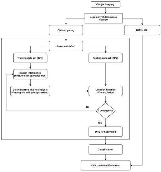 To discover the morphological DRS for the impact of maternal age on oocyte morphology, we used a novel combination of artificial intelligence methods, including deep learning [20,21,22], swarm intelligence [7,23,24], and discriminative analysis [25,26]. Subsequent to the DRS discovery, we applied our new DRS to brightfield microscopy images of oocytes obtained from aged mice that had been treated with nicotinamide mononucleotide (NMN). NMN is an orally deliverable metabolic precursor to the metabolic redox cofactor nicotinamide adenine dinucleotide (NAD+) and is essential for energy metabolism (via its involvement in the electron transport chain), DNA repair, and epigenetic homeostasis. We have previously shown that NMN positively impacts female reproductive aging [27]. In this way, we tested our hypothesis that the DRS would be sensitive to reversals of the impact of aging by comparing the morphology of old, NMN oocytes to that of young and old oocytes. To the best of our knowledge, this is the first study where age-related oocyte morphological changes have been quantified using artificial intelligence.