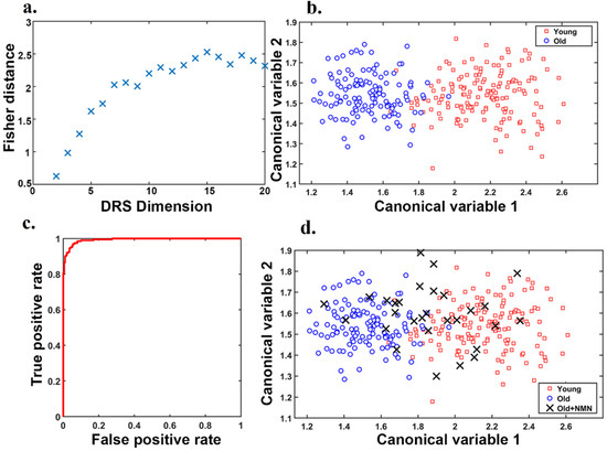 (a) Improvement in DRS discriminative power measured by Fisher Distance (FD) with an increasing number of DRS features. (b) Discrimination of old and young oocyte morphology using our optimal DRS (points represent oocytes with data augmentation: Number of old data points after augmentation = 126, Number of young data points after augmentation = 156), Figure with no data augmentation is shown in Supplementary Figure S4 (c) Classification performance curve of receiver operating characteristics (ROC) for our optimal DRS with 15 features. (d) DRS discrimination of oocytes from young and old animals as shown in (b) overlaid with oocytes from aged animals treated with the NAD precursor NMN (Number of NMN data points = 29), each data point represents an individual oocyte.