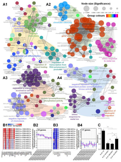 Upregulated differentially expressed genes (DEGs) in the M-MSCs were selected based on fold changes (FCs) 4 times higher than BM-MSCs or AD-MSCs while downregulated DEGs based on FCs were 0.25 times lower. For the selected DEGs, a Gene Ontology (GO) network and Enrichment Pathway analysis were performed using ClueGO 2.5.7 and CluePedia 1.5.5 on Cytoscape 3.7.2 (Cytoscape Consortium; San Diego, CA, USA) on Java script 1.8.0_162 (Oracle Corporation; Santa Clara, CA, USA) [16]. ClueGo analyses incorporated GOs for GO_BiologicalProcess-EBI-UniProt-GOA-ACAP-ARAP_08.05.2020_00h00: 17972 (The European Bioinformatics Institute; EMBL-EBI, Cambridgeshire, UK). The pathway’s restriction was set to a p < 0.05, and a GO tree interval with a minimal from 4 to maximal of 6 was used to specify GO terms. The minimal number of genes in a GO was set to 3 while the connectivity score (Kappa Score) was set to 0.4.