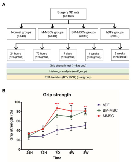 Schematic diagram of the study, effects of MSC injection on grip strength recovery after RCT induction. (A) Schematic diagram of the study. Seven-week-old SD rats were randomly divided into 20 groups, and cell injection was operated on the right shoulder. At 5 times, 8 mice per group were sampled and used for the experiment. (B) M-MSCs, BM-MSCs, or control hDFs were injected to RCT model rats. At 24 h, 72 h, 7 days, 4 weeks, and 8 weeks after RCT induction, the grip strength tests were conducted for each rat. The data are shown as mean ± SD and the significance was represented as * p < 0.05; ** p < 0.01; *** p < 0.001, respectively.
