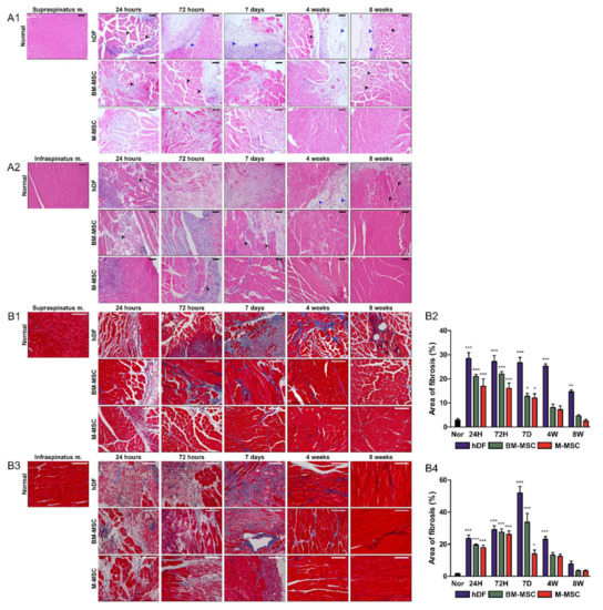 Fibrosis was confirmed by MT staining. In the supraspinatus muscle, the M-MSCs and BM-MSCs groups showed a significant difference compared with the normal group, accounting for about 20% of the total area of fibrosis until 72 h. The fibrotic area was reduced and recovered to almost the same value. In contrast, in the hDFs group, a significant range of fibrosis was confirmed at up to 8 weeks (Figure 3B1,B2).