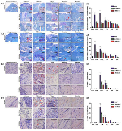 Next, macrophage infiltration was confirmed by CD68 staining. In the M-MSCs group, macrophages were found with a significant difference from the normal group only at 72 h in both the supraspinatus and infraspinatus. In the case of the hDFs and BM-MSCs groups, macrophages were detected even after 72 h, even on day 7. Almost no macrophages were detected in the supraspinatus and infraspinatus at 24 h in all three groups, and almost no macrophage was detected even after 4 weeks. Both mast cells and macrophages were hardly detected after 4 weeks, but were found at the initial stage before day 7 (Figure 4B1–B4). The M-MSCs group also showed less inflammatory response than other groups.