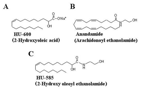 Structures of the synthetic compounds tested for anticancer activity. Structures of (A) HU−600 (Minerval, 2−hydroxyoleic acid), (B) anandamide (AEA) and (C) HU−585 that was obtained by structural modification and the addition of AEA side chain to HU−600.