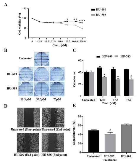 In order to evaluate the antitumorigenic effects of HU-600 and its derivative, HU-585, on SK-N-SH cells, we used MTT, CFU, and migration assays (Figure 2). The choice of concentrations used in these assays (12.5–200 µM) is based on previous data showing that the IC50 of HU600 for most cancer cells studied is in the range of 30–250 µM [16,21,22]. A similar and significant dose-dependent decrease in cell viability was demonstrated by both compounds at a concentration of 12.5 µM (16.7%, p < 0.05). The effect on cell viability reduction was significantly better for HU-585 treatment in comparison to HU-600 treatment at concentration of 75 µM and above: 33.5% vs. 14.4% at 75 µM; 34.3% vs. 14.7% at 100 µM; 52.2% vs. 23.2% at 200 µM, respectively. * p = 0.03, ** p = 0.02, *** p = 0.01, respectively (Figure 2A).