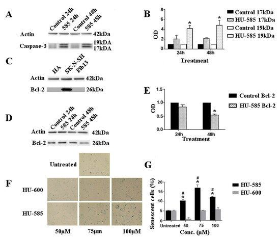 Growth suppression by HU-585 is mediated by apoptosis and senescence. (A–E) Apoptotic effects of HU-585. (A) Caspase-3 assay. Western blot of caspase-3 (35 kDa) cleavage to 19 kDa and 17 kDa represents the apoptotic effect of HU-585. SK-N-SH cells were treated with 100 µM of HU-585 for 24 h and 48 h. (B) Quantification of cleaved caspase-3. Quantification was done by Image Lab software and representation for 24 h and 48 h of incubation are shown. Cleaved 19 kDa level increased significantly in a time-dependent manner in comparison to its control following treatment with HU-585. Statistical differences at 24 h and 48 h were determined by two-way ANOVA (* p < 0.01). (C) Bcl-2 protein levels. Western blot of Bcl-2 protein levels determination for human astrocyte cell line (HA), SK-N-SH cells and fibroblast cell line (as a “normal control”). High levels of Bcl-2 protein were detected in SK-N-SH cells compared to the other cell lines. (D,E) Apoptotic effects of HU-585 analyzed by Bcl-2 levels following treatment. (D) Western blot of Bcl-2 protein levels in SK-N-SH cells following treatment with 100 µM HU-585 for 24 h and 48 h. (E) Quantification of Bcl-2 protein. Quantification was done by Image Lab software following treatment with 100 µM of HU-585 for 24 h and 48 h. Results revealed that the level of Bcl-2 protein decreased in a time-dependent manner, reaching maximal and significant effect at 48 h. Statistical significance was determined by Unpaired t-Test (* p < 0.001). (F,G) Senescence effect of HU-585 analyzed by β-galactosidase staining. (F) Activity of β-galactosidase in SK-N-SH cells following HU-600 and HU-585 treatment was measured by β-galactosidase staining. SK-N-SH cells were plated in 6-well plates and treated with 50 μM, 75 μM and 100 μM of HU-600, HU-585 or no treatment as control. Positivity for β-galactosidase following 48 h of treatment represents the cells that are in senescence. (G) Representation of the quantified percentages of senescent cells. Results show an increased number of senescent cells following HU-585 treatment compared to HU-600 treatment and untreated cells. Data is reported as mean ± SE of triplicates. Statistical significance was determined by GEE test. * p < 0.05 compared to HU-600 and # p < 0.05 compared to untreated cells.