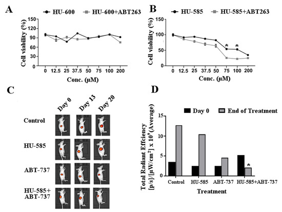 The combination of HU-585 with anti Bcl-2 compounds results in enhanced tumor growth delay in vitro and in vivo. (A,B) The effect of combination therapy of ABT-263 with HU-600 or HU-585 on SK-N-SH cells viability. The cells were plated in 96-well plate and treated with increasing concentrations of HU-600 (A) or HU-585 (B) for 72 h, with or without 2.5 µM of ABT-263. Viability measurements are shown by MTT assay and demonstrate a better effect of ABT-263 treatment combined with HU-585 in comparison to HU-585 alone. A similar effect was not obtained following combination of ABT-263 with HU-600. All values are normalized to control. Data are expressed as percentage of the vehicle control and are the mean of pooled results from several experiments performed in triplicate. Statistical significance was determined by GEE test, * p < 0.05 compared to HU-585 + ABT263 (0.86 < SE values < 4.22). (C,D) Combined treatment of ABT-737 with HU-585 inhibited tumor growth in mice model. A total of 5 × 106 SK-N-SH expressing mCherry cells were subcutaneously inoculated in the right flank of nude mice. The mice were divided into four groups and given vehicle, HU-585 (120 mg/kg), ABT-737 (75 mg/kg) or combination of HU-585 with ABT-737 (120 mg/kg, 75 mg/kg, respectively) once daily by IP injections for 21 days. (C) Tumor burden was followed by IVIS system once a week during treatment. (D) Average total radiant efficiency signal was significantly lower following combined treatment with HU-585 and ABT-737 compared to control or HU585 alone. The Kruskal-Wallis test and the post hoc Dunn’s multiple comparisons test were used to evaluate significant differences in the growth rate of xenografts between treatment groups, * p < 0.05 compared to control and HU-585.