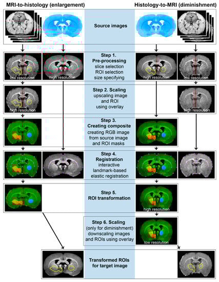 We propose here a new simple approach based on an adequate transformation of ROIs for the explored images while the original raw MR and histological images remain unchanged. Free available Fiji (ImageJ) software [] was employed for the development of the method and its validation using a quantitative comparison of ROIs from rodent brain MR images and corresponding histology sections of the same brain.