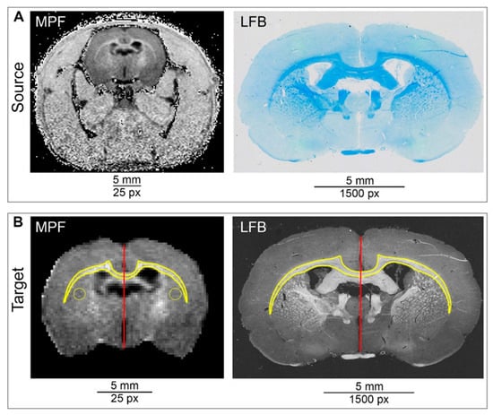 Pre-processing of MR and histological images. (A) Example of source (MR) and target (histological) images. Source image is represented by one slice of 3D MPF map; target image is presented by a micrograph of anatomically matched brain section stained with LFB. (B) Source and target images after pre-processing with ROI selection. ROIs for measurements and method validation (delineated corpus callosum and two symmetrical round ROIs in the left and right caudoputamen) are marked with a yellow line. Linear red line ROIs are added for a vertical size assessment of the source and target images which are necessary for further transformation and scaling.