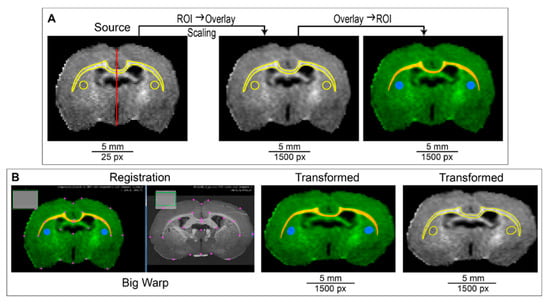 Steps 2–6 of the ROIT method. (A) Scaling of source image (step 2) and the creation of the RGB composite image (step 3). (B) Registration of the source MR image to target the histological image using the Big Warp tool and splitting a registered composite image into RGB channels to obtain transformed ROIs.