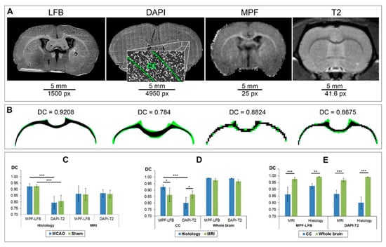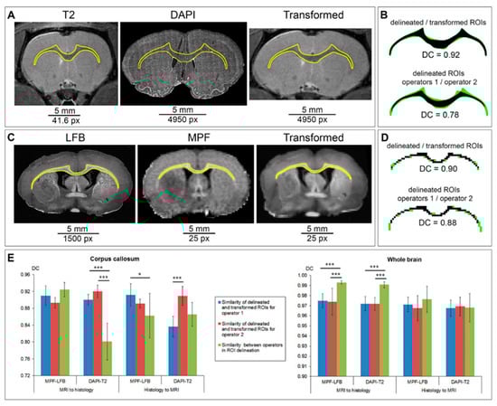 Correspondence between the transformed and delineated CC and brain section. (A) Example of ROI transformation of MR image to histological image. (B) Example of the ROI transformation of histological image to MR image. (C,D) Correspondence of the transformed and manually delineated CC and brain section in comparison with the correspondence between operators for CC (C) and brain section (E). Error bars correspond to the SD. Significant differences: * p < 0.05, ** p < 0.01, *** p < 0.001.