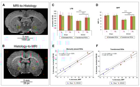 Correspondence of LFB OD and MPF measurements performed by the ROIT method and manual ROI placement on LFB-stained images and MPF maps in MCAO and sham-operated rats. (A,B) Example of the inverted red channel of the LFB image (A) and MPF map (B) of MCAO animal with ROIs into the ischemic lesion (IL) and contralateral side (CL). Manually placed round ROIs are marked by the red color; transformed ROIs are marked by the green color. (C,D) MPF (D) and LFB OD (C) measurements in the ischemic lesion (same size ROI in caudoputamen in sham-operated animals) and anatomically matched contralateral hemisphere. Error bars correspond to standard deviations. Significant differences: *** p < 0.001. (E,F) Linear regression plots of percentage changes in LFB OD, which were measured in manually placed (E) or transformed ROIs in the ischemic lesion relative to the symmetric contralateral anatomical region as a function of percentage changes in MPF.
