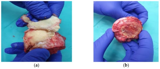 (a) Cartilage denudation and necrosis of the femoral head-macroscopic appearance and (b) Femoral head osteotomy site-thermo-generated necrosis of adjacent bone tissue.
