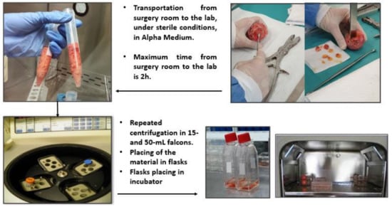 Residual tissue pieces have been extracted from the medullar area of the femoral head since it has been observed that these generate a higher number and improved quality of cell populations. An orthopedic curette and chisels were used to extract the tissue parts varying between 0.3 to 0.5 cm; further on, these were transferred to sterile plastic containers with alpha-MEM, 10% FBS and 1% penicillin/streptomycin. The sterile containers were then placed in a thermo-insolating box (Thermobox, Delta T, Fernwald, Germany) with ice and transported to laboratory in an interval of maximum 2 h. Bone fragments were washed with PBS to detach cell debris, erythrocytes and remaining fats and transferred in culture medium for MSCs. Centrifugation was applied for 8 min at an angular frequency of 2500 r/min, to facilitate the mobilization of MSCs from the stroma. Further on, the lipid layer was removed under laminar flow cabinet. Remaining medium with extracted cells and bone pieces were placed in T75 cell culture flasks. Each T75 flask contained about 5–6 pieces of bone and culture medium specific for MSCs: Alpha Minimal Essential Medium (Sigma Aldrich M4655, St. Louis, MO, USA) with 10% Fetal Bovine Serum (Sigma Aldrich F7524, St. Louis, MO, USA), 50 µg/mL Amphotericin B (Sigma Aldrich A2942, St. Louis, MO, USA), 25µg/mL Gentamycin (Sigma Aldrich G1397, St. Louis, MO, USA), 50 μg/mL L-ascorbic acid (Sigma Aldrich A4403, St. Louis, MO, USA). For osteogenic differentiation 10−4 M Dexamethasone (Sigma Aldrich D4902, St. Louis, MO, USA) has been added at the first passage. The schematic representation of the harvesting procedure may be seen in Figure 2.