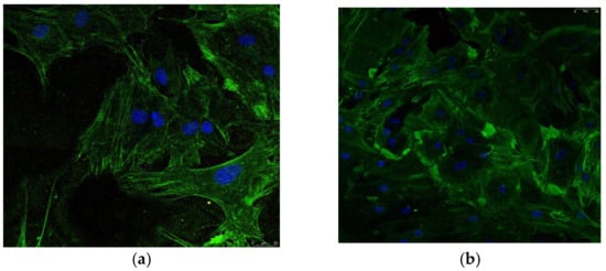 Representative confocal images of cells on the various tested substrates can be seen in Figure 10. It must be noted that no differences were found between cells morphology when seeded on the same substrate category e.g., (GNPs reinforced PEI compared to HAp reinforced PEI); more precisely, the reinforcement type in the case of electrospun materials or the diameter of pores on 3D printed scaffolds did not affect the cells morphology or proliferation. The morphology of cells looks almost similar after one day of incubation, when they are seeded on polystyrene (Figure 10a) and on titanium substrates (Figure 10b). Flat substrates visibly promote cells proliferation within the first hours of incubation. However, cells on titanium are less developed and less interconnected compared to those on polystyrene.