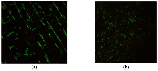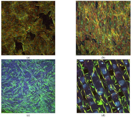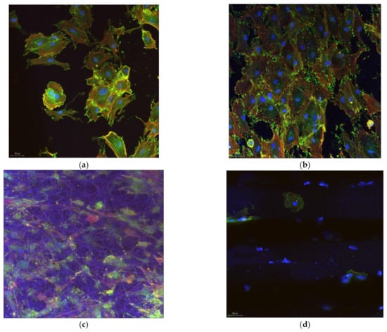 After 7 days of incubation, cells cover almost the entire surface of the polystyrene substrate (Figure 11a). They are strongly interconnected and form a dense layer with very small, uncovered areas of the substrate. On titanium, cells look spatially restricted; their morphology adapt to the microenvironment and become more needle-shaped to save space. Cells on electrospun scaffold, on the other hand, spread differently penetrating the material and occupying the multi-level space within the scaffold. Although not so prominent as on polystyrene, cells on the 3D electrospun scaffold (Figure 11c) may be seen everywhere on the analyzed area, at the surface and between the underneath fibers. Further on, after 7 days of incubation it may be observed how osteoblasts cover the fibrous area of 3D printed scaffolds (Figure 11d). The robust structure offers a synthetic skeleton-like network which induces positive biosignaling in cells and enables migration. Comparing to the electrospun fibers, the 3D printed ones determine a unidirectional orientation of cells. It may be observed how they develop mainly along the fibers. Finally, all plastic substrates promote proliferation of cells in different modes. Cells on flat polystyrene develop rapidly in a 2D formula, while 3D scaffolds enable proliferation on different levels and directions. In the case of electrospun substrates, cells scan the 3D structure, and it may be seen how they interconnect with cells on a different level within the scaffold. On the 3D printed scaffolds, cells are distributed mainly unidirectionally along the fibers’ length; however, images inside the scaffold cannot be acquisitioned at this point. The two main causes that determine a different behavior of cells on the electrospun scaffolds compared to the 3D printed scaffolds are the nano vs. macro fibers and low vs. high elasticity modulus.