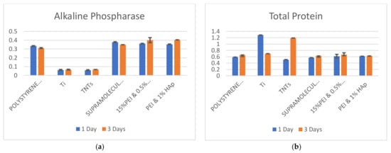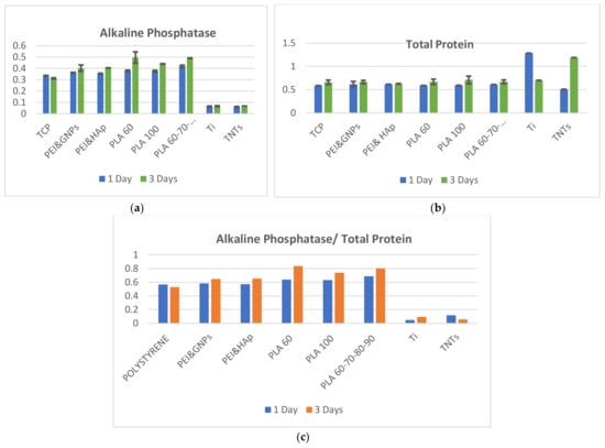 Metallic substrates induce completely different feedback in cells compared to plastic scaffolds. Several studies [47,49] have previously demonstrated that strong adhesion of osteoblasts on titanium surfaces limits their movements, which negatively impacts their development. The interaction between titanium and osteoblasts is of two types, biochemical and electrostatic, respectively, while adhesion depends in a high extent on material topography and contact area. In Figure 7a, one may see that the ALP in osteoblasts on titanium is appreciable lower than on polymeric substrates. In Figure 7b, the TP level in cells on titanium substrates indicates the strong adhesion and the bond with the pure titanium/TNTs, by an increased protein amount in cells. Due to the high value of TP in the case of these two substrates, it is expected that the ALP/TP ratios will decrease, which can be clearly seen in Figure 7c. Furthermore, we observe (Figure 7b) that after 3 days of incubation on TNTs, the number of proteins is extremely high compared to day 1; the increased contact area conferred by the nano-dimension of the nanotubes leads to cells swallowing into the substrate; this has been previously proved [50]. Finally, Figure 7c shows that ALP/TP levels in cells on titanium and TNTs is extremely low compared to the polymeric materials. After 3 days of cell incubation on TNTs, this value cannot be distinguished in the diagram. Results underline that polymer-based composites such as GNPs reinforced PEI and HAp reinforced PEI enhance cellular activity after 3 days of incubation compared to metals.