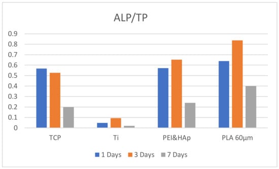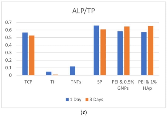 As observed below, ALP quantity in osteoblasts on SP is lightly higher than in osteoblasts on TCP. However, it can be noticed that after 3 days of incubation, this quantity is reduced. ALP level is almost similar in osteoblasts populations on GNPs reinforced PEI and HAp reinforced PEI, for both 1 and 3 days of incubation. This indicates the reproducibility of the results since in both cases, cells come in contact with the PEI matrix and not with the reinforcement. The quantity of ALP increases in the third day of incubation. This indicates that both types of composites assure an appropriate microenvironment for osteoblasts development. At this point it may be affirmed that selection of one of the two electrospun composites for further investigations can be made according to their mechanical performance. A combination of GNPs and HAp reinforced PEI may be considered as well. Since higher ALP values will assure higher ALP/TP ratios, GNPs reinforced PEI and HAp reinforced PEI are superior to the other plastic substrates. It may be further observed in Figure 7b that TP values in osteoblasts on all substrates increase after 3 days of incubation, compared to day one. This is expected and is related to the bonds and adhesion of cells on substrates; connection is stronger as hours pass. Osteoblasts’ adaptation and adhesion to a substrate is crucial withing the first 72 h of cells incubation on the substrates; this process decides the material fate and the osseointegration rate. Alves and Wassall [49] reported interesting results after immersing implant samples into an osteoblast-like cell suspension for a period of 24, 48 and 72 h. After seeding the cells, samples were prepared for analysis with scanning electron microscopy. Based on surface analysis, osteoblastic cells adhered to the tested metallic surface after 24 h in culture. In 48 h, cells spread over the implant surface, and after 72 h a proliferation of cells with large and flat bodies was observed over the machined implant surface. Although both chemistry and surface structure of metallic and electrospun materials differ, the time of cells in vitro development can be similar for various substrates; despite that, cells’ morphology can be confusing and should not by itself be considered a key biocompatibility indicator. A real difference in the biocompatibility of substrates, which reflects the true change in cells’ internal state, may be assessed by analyzing the ALP/TP ratio.
