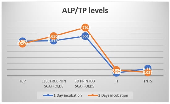 In previous investigations, expression levels in human osteoblasts increased only on the stiffer surfaces (310 MPa) [53]. Higher matrix moduli in 2D and 3D structures have generally been found to promote osteogenesis. Moreover, it has been recently reported that: (i) osteoblasts migration is enhanced on 3D scaffolds compared to flat surfaces due to higher area provided for cells to develop; (ii) osteoblasts proliferation is migration-dependent and is higher on fibrous materials; (iii) osteoblasts adhesion is improved on materials with higher elasticity modulus and (iv) cells differentiation from MSCs to osteoblasts is adhesion-dependent and is enhanced on stiffer substrates with properties similar to the natural bone tissue [54]. The ratio between the alkaline phosphatase and total protein (ALP/TP) is a good indicator of the balance between the above-mentioned processes. A higher ALP/TP ratio means appropriate migration, proliferation, and adhesion of osteoblasts to a substrate. To depict results in the present investigation, representative values of ALP/TP were selected for each material category (TCP, titanium, TNTs, 3D electrospun scaffolds, and 3D printed scaffolds) and are plotted in Figure 12.