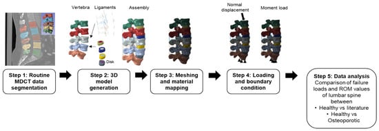 In the current computational study, we have followed a five-step methodology. In the first step, the routine MDCT data were automatically segmented. In the second step, the patient-specific 3D lumbar model was generated. Then the annulus fibrosus and nucleus pulposus of the intervertebral discs (IVDs) and ligaments were modeled separately and assembled with the vertebra. In the third step, the assembled lumbar model was meshed and image intensity-based material properties were mapped to the FE mesh. In step four, loading and boundary conditions were applied, and the model was solved. Finally, in step five, the data analysis was performed on the FE results. Figure 1 shows the schematic representation of the complete workflow followed in the current study.