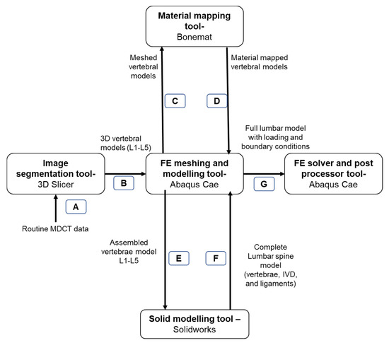 The flow of segmented models between different processing tools in the current computational study. A—Importing the routine clinical data to image segmentation tool; B—Importing of segmented vertebral models to finite element (FE) preprocessor; C—Importing of meshed vertebral models to material mapping tool; D—Importing of material-mapped models to FE preprocessor; E—Importing of the assembled vertebral model to solid modeling tool for the generation of IVD and ligaments; F—Importing the complete lumbar spine model to FE preprocessor; G—Application of loading and boundary conditions to the lumbar model and importing to FE solver.
