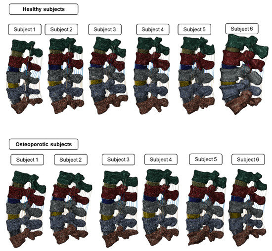 The meshed comprehensive lumbar spine geometries used in the current study. The top row shows the healthy subjects; the bottom row shows the osteoporotic subjects.