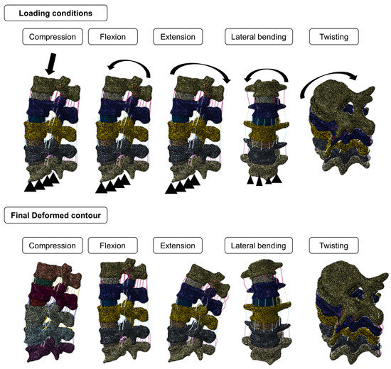 Applied loading and final deformed contours of the lumbar spine models. The top row shows the different loading conditions, i.e., compression, flexion, extension, lateral bending, and twisting. The bottom row shows the final deformation contours for the abovementioned loading conditions.