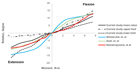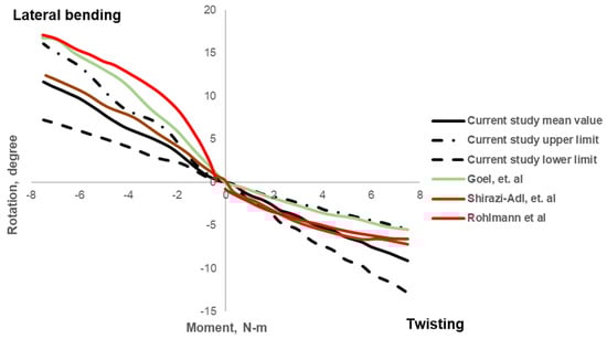 We have observed that FE-derived FL for the healthy lumbar spine models was 1471.50 ± 275.69 N. These FE-predicted failure load values are in a comparable range with the available previous experimental results of 967 N to 4387 N [53]. The flexion (F), extension (E), lateral bending (L), and twisting (T) were similar to those in previous experimental results and computational studies [46,53,54,55]. The maximum mean ROM values were also in the range of previously published literature: 11.11° ± 3.73° vs. 12.59° to 13.36° for F [53,55,56]; 12.05° ± 6.12° vs. 10.12° to 14.45 for E [46,55,56]; lateral bending of 11.80° ± 4.36° vs. 12.39° to 17.08° for L [46,55,56]; and twisting of 8.96° ± 3.7° vs. 5.46° to 7.16° for T [46,55,56]. Based on these results, we can conclude that the routine clinical data could be used to model and analyze the lumbar section of the spine and generate comparable results.