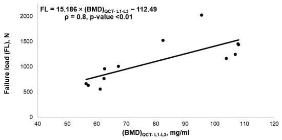 Correlation plot between FE-predicted failure load and QCT BMD, ρ—Pearson correlation coefficient.
